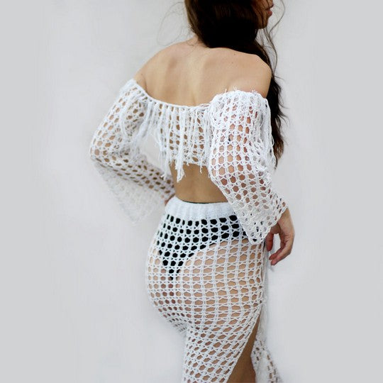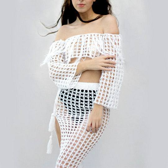 Our most versatile cover up yet, the perfect piece that covers everything from beachside brunches to late night club adventures. This stylish 2 piece set features an off the shoulder 3/4 sleeve fringed crop and a beautiful fringed skirt with an adjustable side slit. Made from 100% cotton yarn, this lightweight cover up is a summer must-have!