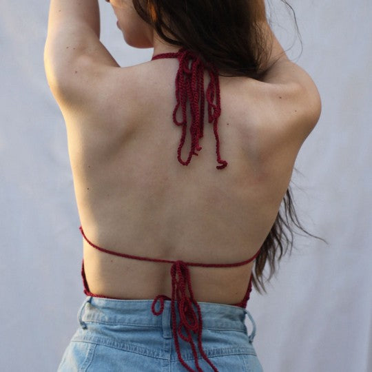 This beautiful crochet crop top has an intricate pattern that is sure to standout. The lace up back allows for a stylish sleek fit that can be adjusted to any body type. The keyhole details in the front and the neckline make this crop top both sexy and feminine. There are no closures needed as it stretches enough to fit snug to the body and lay flat against the skin. This crop top is handmade from soft cotton yarn.