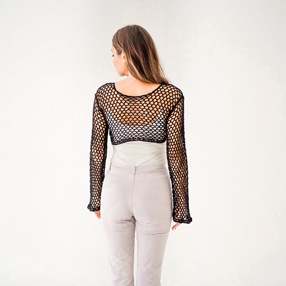 Crafted with attention to detail and quality, our long sleeve bolero style ultra crop top offers both style and comfort. The bolero style of this crop top offers a unique and fashionable twist to a classic silhouette. The cropped length adds a youthful and trendy touch, allowing you to showcase your midriff in a tasteful and stylish manner. The open-front design with no closure allows for easy layering and adds a sense of fluidity to your movements. The loose fit of the sleeves adds a relaxed and effortless vibe, making this top a perfect choice for both casual and dressed-up occasions. Step out with confidence and grace in this exquisite crochet crop top that effortlessly captures attention and showcases your unique sense of style.
