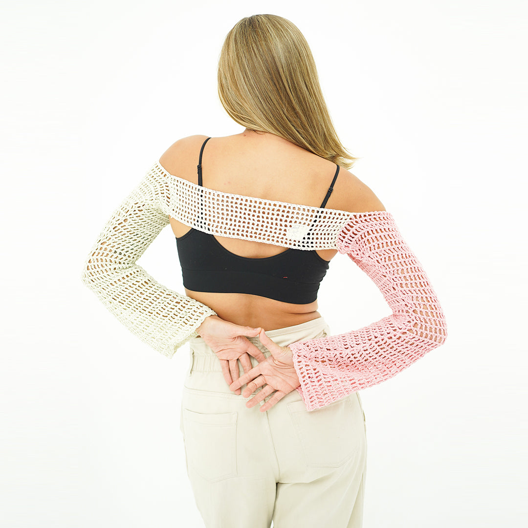 The bolero style crop top features three-quarter length sleeves and a flattering cropped hemline. It is made from a soft and breathable crochet fabric that is perfect for summer weather.